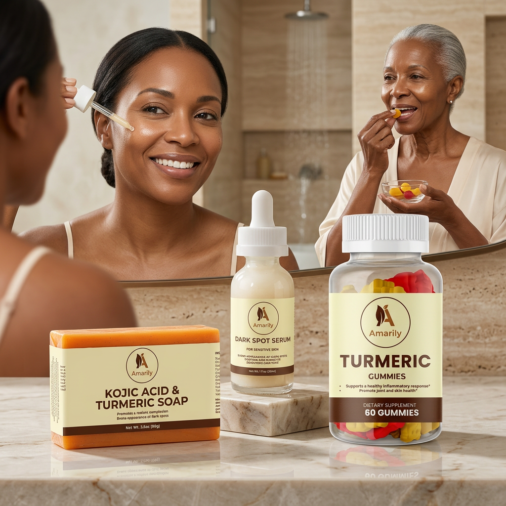 And with our turmeric wellness gummies, your skin is supported from within — helping reduce inflammation and promoting overall skin health for a truly radiant look.